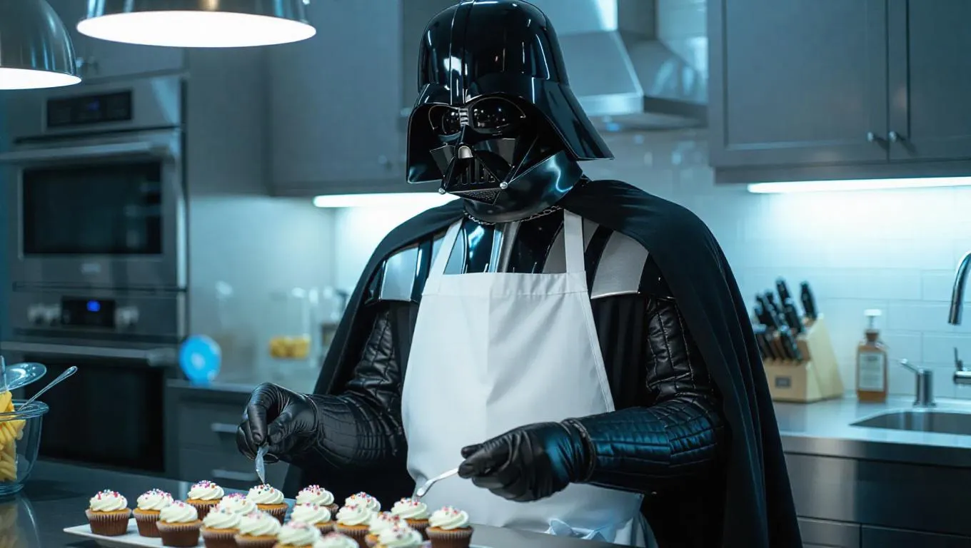 Darth Vader stands in a modern kitchen, wearing a white apron over his dark armor. He skillfully decorates cupcakes on a counter, his expression focused yet serene. The kitchen is bright and sleek, with stainless steel appliances and a minimalist island. Soft, blue light filters in from overhead lights, casting sharp shadows and illuminating the sprinkles scattered on the counter. The scene merges the formidable presence of Vader with the cheerful task of baking.