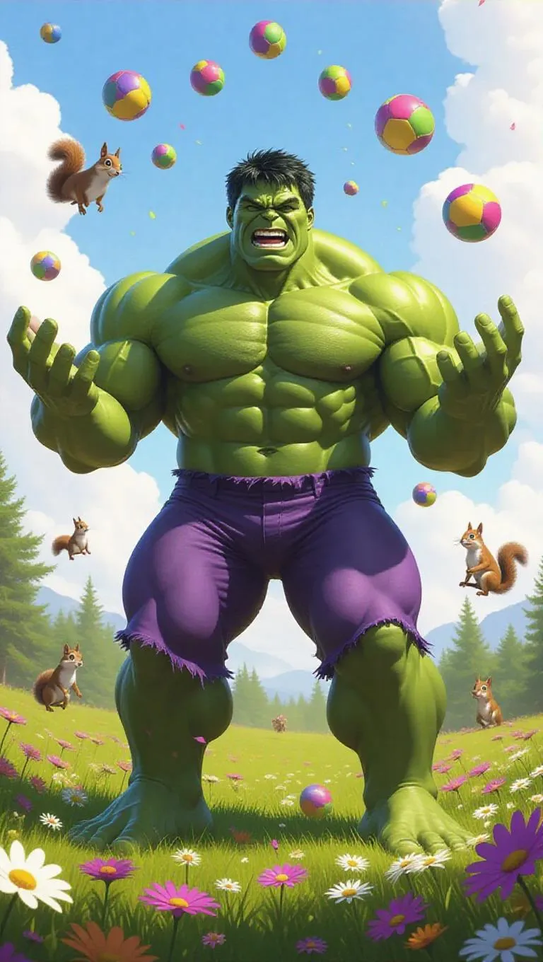Hulk, a towering green giant with a joyous smile, stands in a sunny meadow, juggling colorful balls. His muscles are flexed, and his eyes convey a sense of excitement. Squirrels dart among the grass and flowers, contributing a lively energy to the scene. The sky above is a bright azure, with puffy white clouds scattered. Cheerful sunlight streams down, creating playful shadows and emphasizing Hulk's green skin and the blooming flowers. The style is realistic, with a splash of whimsical fantasy.