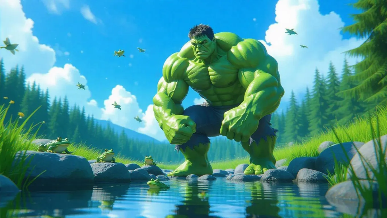 Hulk, a towering green giant with an intrigued expression, crouches next to a bubbling brook, observing fish. His muscles are relaxed, and his eyes convey a sense of curiosity. Frogs leap among the stones, adding a lively spirit to the scene. The sky above is a brilliant blue, with a few clouds floating lazily. Bright light sparkles off the water, creating reflective shadows that highlight Hulk's green skin and the cheerful environment. The style is realistic, infused with whimsical fantasy.