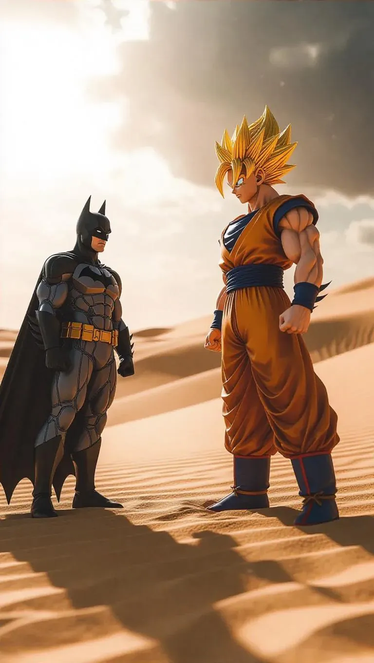 Goku in Super Saiyan Third Form stands on smooth, sandy dunes, his golden hair glowing fiercely. He gazes intently at Batman, who stands confidently nearby. The sandy landscape is bathed in bright, midday sunlight, casting sharp shadows and highlighting the grains of the sand. The sky is overcast, with hints of gray. The lighting is harsh and dramatic, creating a stark contrast between highlights and shadows. The style is hyper-realistic, emphasizing the muscular physiques and serious expressions of both characters.