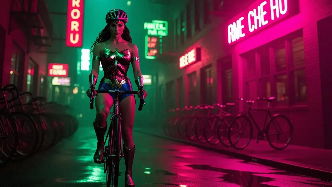 Wonder Woman, in cycling gear and a helmet, stands on a dusty 1940s city street, her athletic expression illuminated by the vibrant neon signs. Bicycles line the roadway, reflecting the gritty pavement. Bold, green light spills from the windows of nearby fitness studios, casting sharp shadows. The scene is rendered in a dynamic style, with strong contrasts and an active, energetic atmosphere.