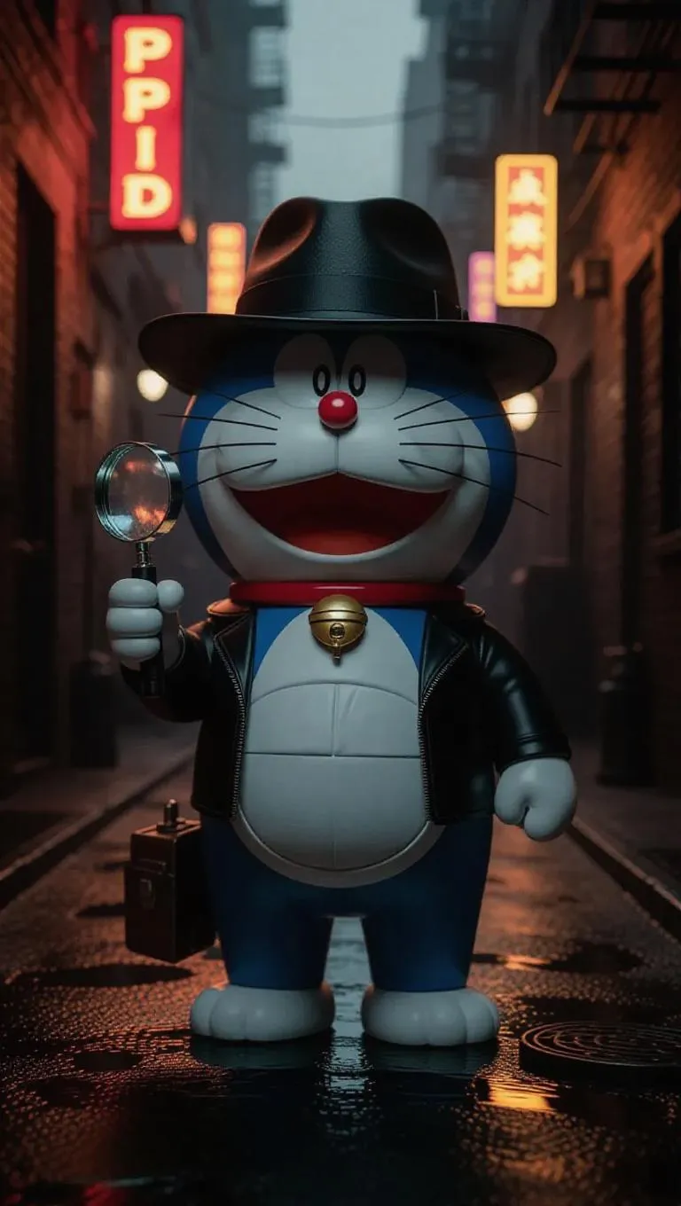 Doraemon, reimagined as a noir detective, stands in a fog-laden alley in 1960s New York. He wears a sleek leather jacket and a wide-brimmed hat, gripping a magnifying glass intently. His gadget pouch now holds ancient, flickering technology. The low, eerie lighting casts dramatic shadows, deepening the noir vibe. Flickering neon signs add a splash of color against the dreary asphalt, heightening the sense of intrigue and suspense. The scene combines vintage sci-fi elements with classic detective noir motifs.
