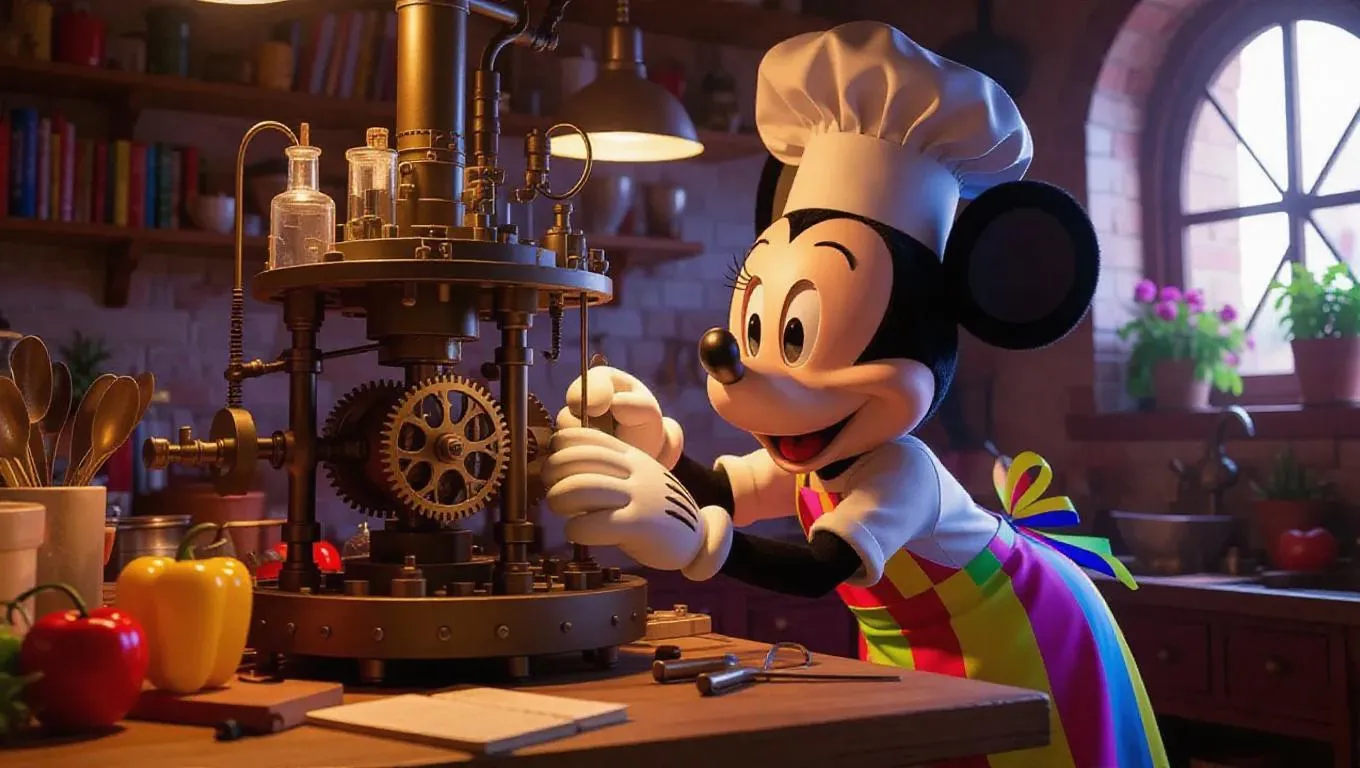 Mickey Mouse, dressed in a creative chef's outfit with a chef hat, a colorful apron, and utensils, is meticulously working on a complex machine filled with intricate gears and steam pipes. He is bent over the contraption, his hands deftly adjusting the mechanisms. The culinary workshop is cluttered with ingredients, cookbooks, and half-finished inventions. Bright, colorful light from overhead bulbs casts long shadows, highlighting the vibrant kitchenware and fresh produce. The scene is rendered in a detailed, realistic style, capturing the culinary charm and mechanical ingenuity of the era.