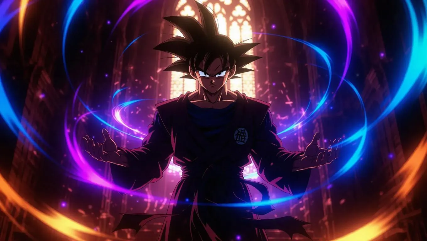 Goku, dressed as a magician in a dark robe, stands amidst swirling magical energies in an ancient castle. His eyes are bright with curiosity, and his expression is contemplative, indicating deep knowledge. The swirling energies create a mystical atmosphere, with arcs of light and shadow enhancing the sense of wonder. The light is vibrant and colorful, adding to the enchanting atmosphere. The scene is rendered in a fantastical style, blending magic and reality.