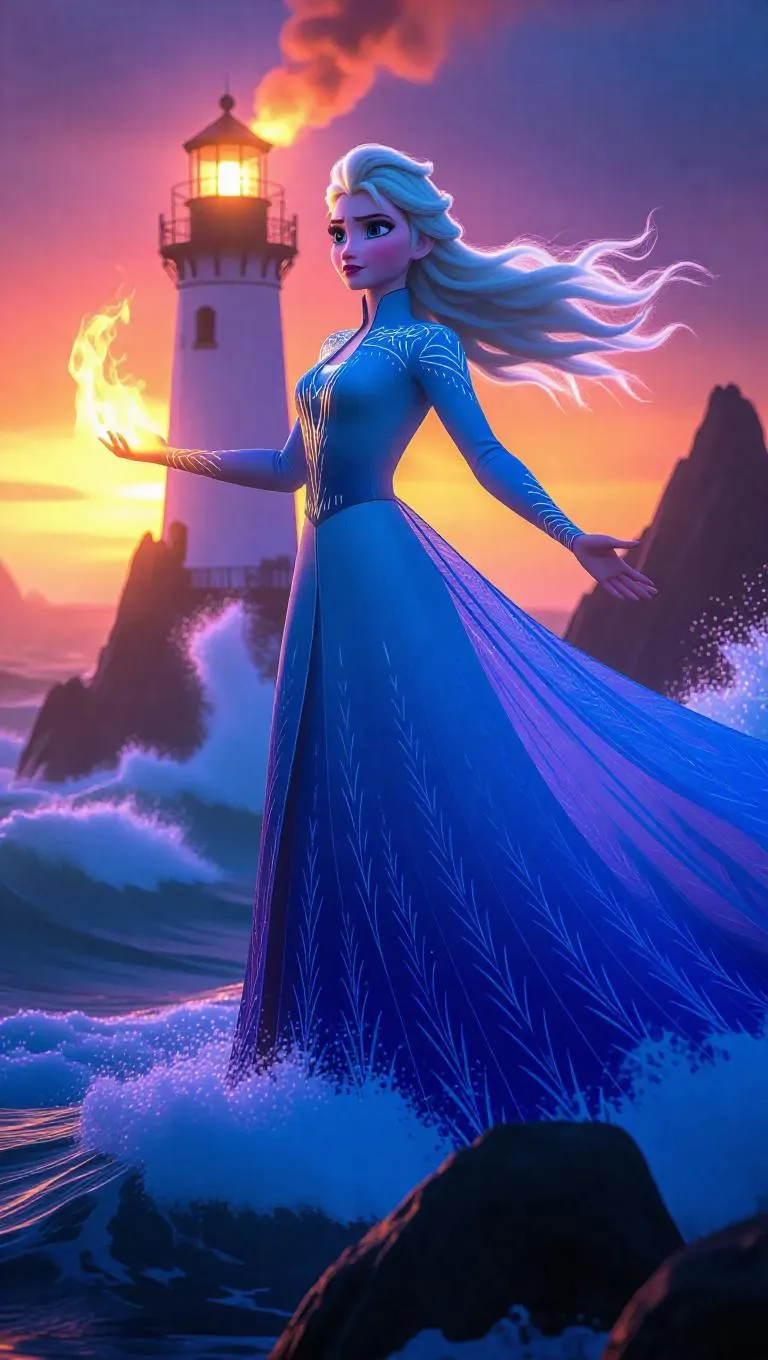 Elsa, with her icy blue hair now touched with twilight purple, stands magnificently on a lighthouse. She wears a flowing, ocean-blue dress with white wave patterns, her arms outstretched as she conjures swirling flames. Roaring waves and crashing rocks surround her, enhancing the dramatic, nautical atmosphere. The sky is a fiery sunset orange, with streaks of purple and blue. Front light highlights her powerful stance, while side light emphasizes the dynamic movement of the flames. The style merges maritime themes with epic fantasy, showcasing the prowess of a sea mage.