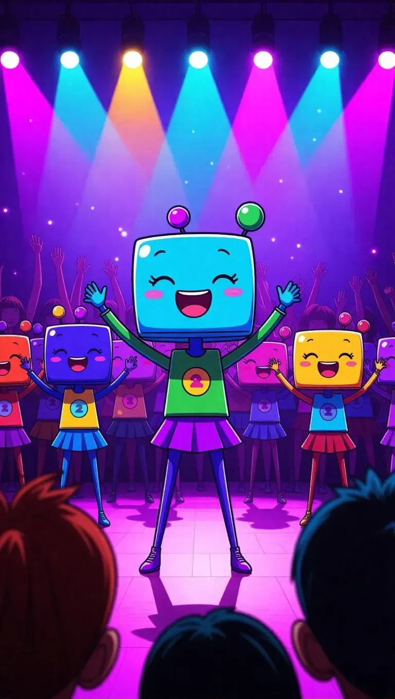 In a 1990s anime-style scene, enchanted objects perform a synchronized dance at a talent show. The objects, with their bright colors and charming forms, move in perfect unison under whimsical lights. The audience cheers joyfully, and the creators express exaggerated, comedic reactions in the background. The stage is drenched in vivid, inviting lighting, creating a lively and humorous atmosphere.
