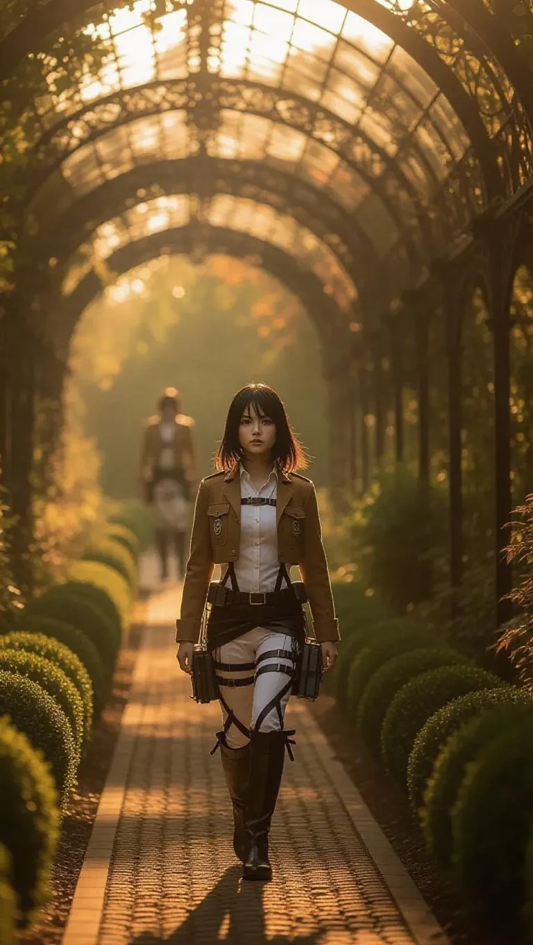 Mikasa from *Attack on Titan* walks along a path in a Victorian garden, reflecting on her adventures. She wears practical travel attire, her dark hair flowing freely. Titans stroll leisurely in the distance, creating an unexpected juxtaposition. Soft rays of golden sunlight illuminate her path, guiding her steps. The garden is beautifully arranged, a testament to artistry and nature. The lighting is soft and warm, inviting contemplation amidst the vibrant world around her.