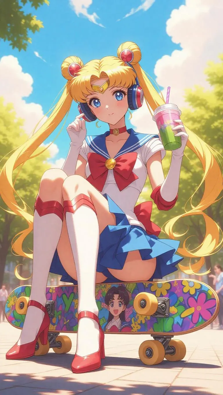 Sailor Moon sits on a graffiti-covered skateboard in a sunlit park, her tiara replaced with oversized headphones and a smoothie in hand. Her vibrant sailor outfit sparkles under the daylight, and retro comic book covers flutter behind her. The scene is filled with soft, golden sunlight, with a mix of bright colors. The style is retro pop art, blending cheerful elements with nostalgic vibes.