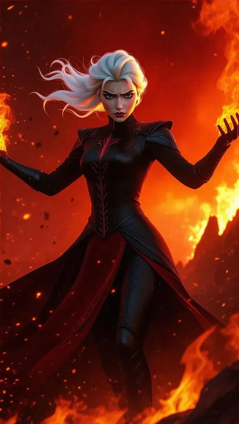 Elsa, with her icy blue hair now highlighted with fiery orange, stands defiantly on a fiery battlefield. She wears a sleek, black armor with crimson embellishments, her arms outstretched as she casts swirling flames. Ashen remnants and fiery sparks surround her, contributing to the dark, warlike atmosphere. The sky is a blazing red, with thick smoke swirling. Front light highlights her fierce determination, while side light emphasizes the raw power of the flames. The style merges gritty realism with high fantasy, portraying the ferocity of a war mage.