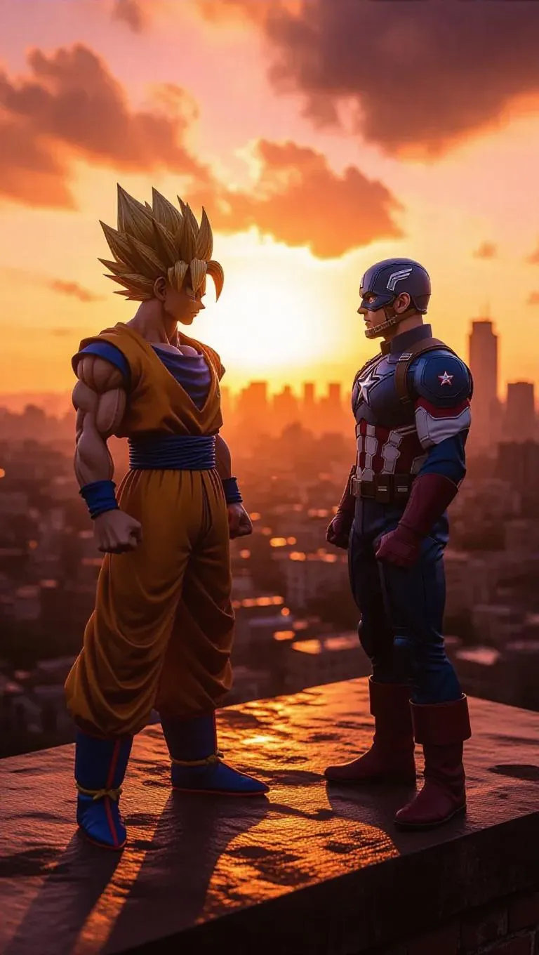 Goku in Super Saiyan Third Form stands on a dusty, urban rooftop, his golden hair glowing powerfully. He gazes intently at Captain America, who stands confidently nearby. The city skyline is bathed in golden sunset light, casting dramatic shadows and highlighting the buildings. The sky is painted in hues of orange and purple. The lighting is dynamic and cinematic, creating an intense contrast between highlights and shadows. The style is hyper-realistic, emphasizing the muscular physiques and intense expressions of both characters.