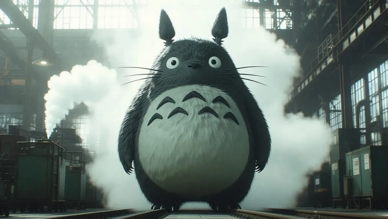 Totoro stands tall amidst an industrial factory, his large, furry body dwarfing the machinery. Smoke billows around him, casting dark shadows, while assembly lines buzz with activity, bathing the scene in gritty metallic tones. Totoro's eyes gleam with determination, his whiskers twitching as he observes the industrious environment. Harsh, artificial light from above illuminates his gentle expression, creating a striking contrast between nature and machinery. The style blends realistic and industrial elements, emphasizing the hard-working yet fascinating setting.