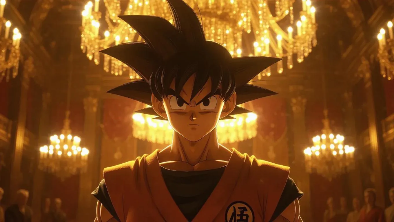 Goku, dressed in elegant royal attire, stands in a grand palace illuminated by chandeliers. His eyes are calm, and his expression reflects authority and poise. The golden light casts a regal atmosphere, with soft shadows creating a sense of depth in the opulent setting. The light is warm and rich, enhancing the grandeur of the scene. The scene is rendered in a luxurious style, portraying the elegance of nobility.