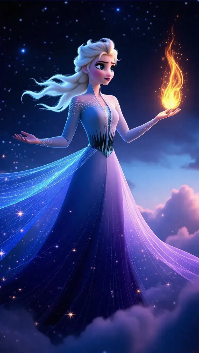 Elsa, with her icy blue hair now shimmering with dark gold, stands lyrically in an ethereal dreamscape. She wears a soft, flowing lavender gown lined with glittering stars, her arms outstretched as she weaves swirling flames. Floating clouds and twinkling constellations surround her, enhancing the dreamlike atmosphere. The sky shifts between shades of deep navy and sparkling white. Front light highlights her dreamy expression, while side light captures the graceful rhythm of the flames. The style merges a surreal dream with fantasy elements, embodying the illusion of a dream mage.