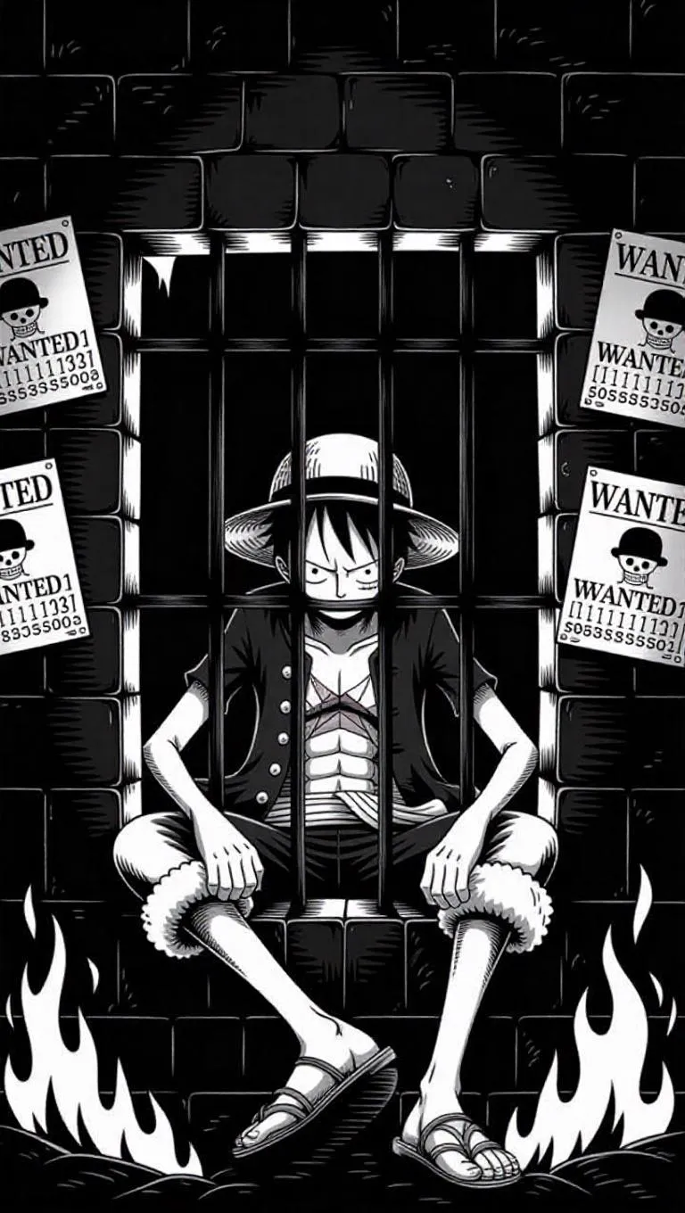 Luffy from One Piece, restrained and dimmed, gazes from a broken window in a dark prison cell. His once spirited figure is now gaunt and weary, his eyes lingering on a mix of hope and despair. The walls are filled with tally marks and distressing "Wanted" posters. The desolate, black-and-white scene is brightened by flickering flames, creating an eerie atmosphere and emphasizing the oppressive mood. The style is depicted in a dramatic narrative, showcasing the melancholic surroundings.