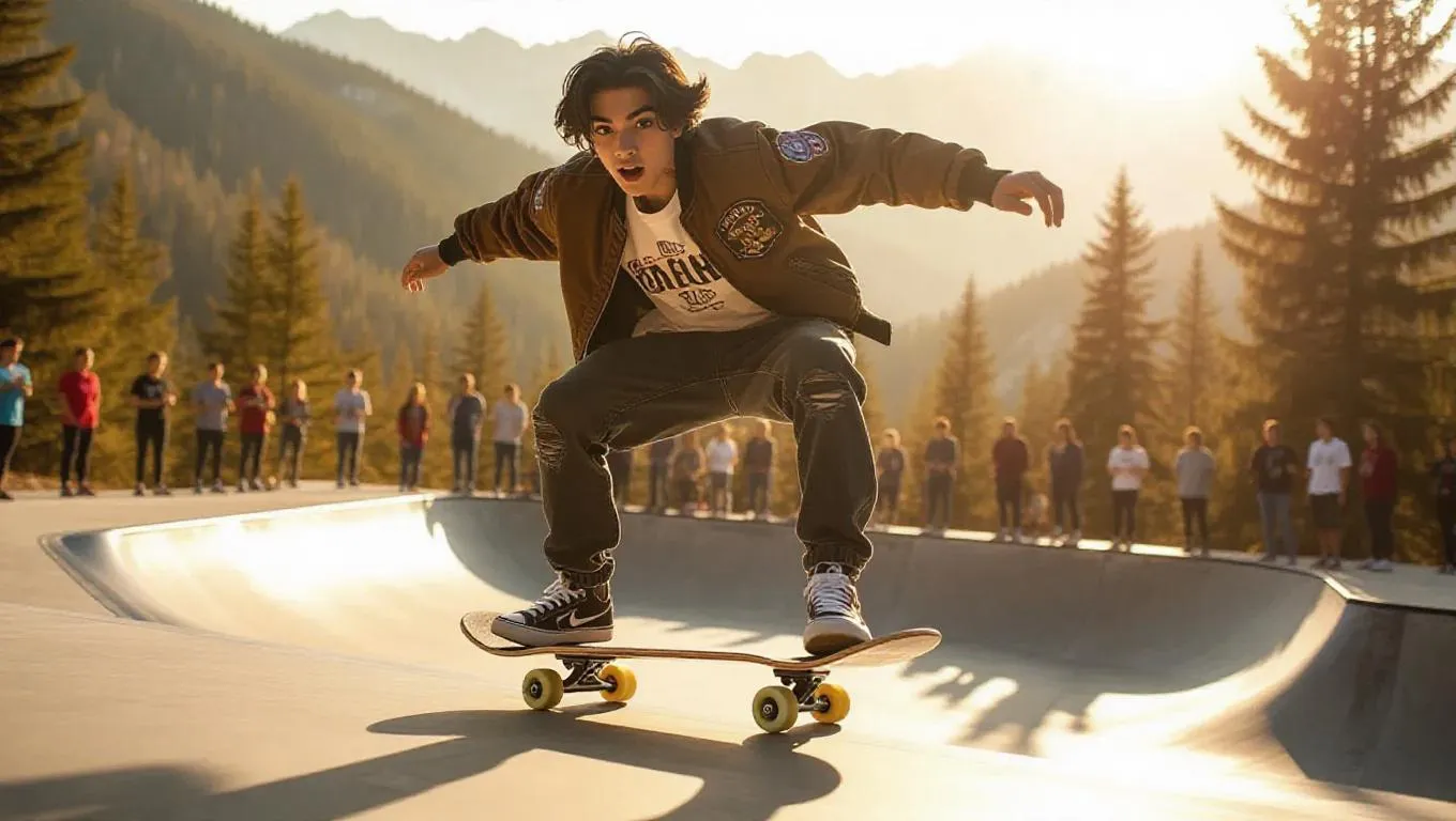 Aladdin, dressed in a stylish bomber jacket and trainers, performs daring skateboard tricks in a dramatic mountain skate park. His adventurous movements and excited expressions thrill a gathering of outdoor enthusiasts. The park is surrounded by towering trees and stunning vistas, creating a breathtaking backdrop. Soft, golden sunlight filters through, casting warm, diffused light that emphasizes the dynamic action within the picturesque landscape.