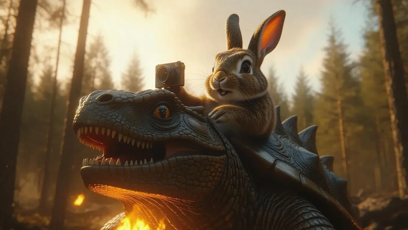 A photorealistic 8K quality scene captures a rabbit riding on the shell of the monstrous Gamera, who is breathing fiery flames. The rabbit, with an excited expression, takes a selfie with a camera. The background shows a lush forest, with charred trees and smoke rising in the distance. Soft, golden light casts dramatic shadows, enhancing the comical yet chaotic atmosphere. The style is hyper-realistic, blending humor with destruction.