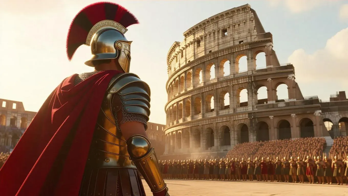 Buzz Lightyear, suited in classic Roman armor, strides through the Forum, advancing towards a rival gladiator in an epic arena match. His helmet is adorned with a distinctive star emblem, and his cape flows dramatically behind him. The spectators roar with enthusiasm, waving laurel wreaths and cheering from their seats. A grand coliseum stands in the background, its arches and sculptures contributing to the historical atmosphere. Glorious midday sunlight bathes the scene, casting warm, golden highlights on the warriors and the audience, capturing a moment of ancient valor and imperial splendor.