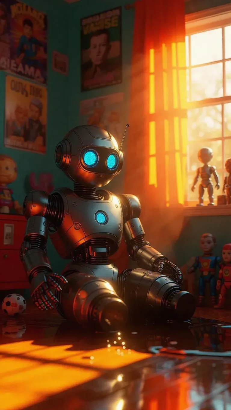 A photorealistic scene of a malfunctioning AI robot, now leaking oil and sitting in a retro child's room. The room is vibrant with action figures and vintage posters, evoking a sense of nostalgia. A single ray of orange sunset light streams through a colorful window, casting a warm glow on the robot, highlighting the contrast between its metallic surface and the lively decor around it.