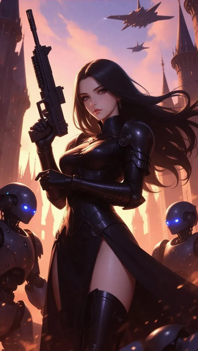 Snow White, in an anime style, holds a sleek laser rifle, her determined gaze set on leading a resistance against an AI-run kingdom. Her flowing black hair contrasts with her white skin, and she wears a modern, armored dress. Robotic dwarves with glowing visors stand by her side, ready for battle. The background features a ruined palace, with crumbling towers and debris scattered around. Flying ships hover overhead, casting ominous shadows. Soft, warm light illuminates Snow White, while harsh, cold light from the flying ships adds tension. The style is a blend of futuristic and classic fairy tale elements.