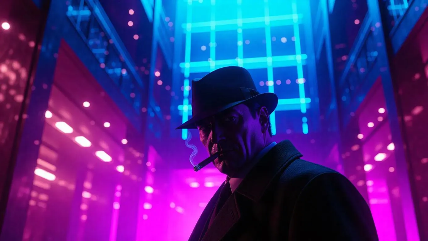 A rugged adult Detective Conan, with frowning features and a cigar, investigates a terrorist cell in a shadowy, neon-lit hotel lobby. High-tech clues float on holograms, casting a chilling glow. The lobby's luxurious, yet oppressive design contrasts with Conan's worn, determined expression. Soft, cool indigo and violet lights highlight the technology, while hard, warm shadows emphasize his intense focus and the peril of the scene. The style is a blend of noir and action thriller, capturing both the gritty realism and the momentum of danger.