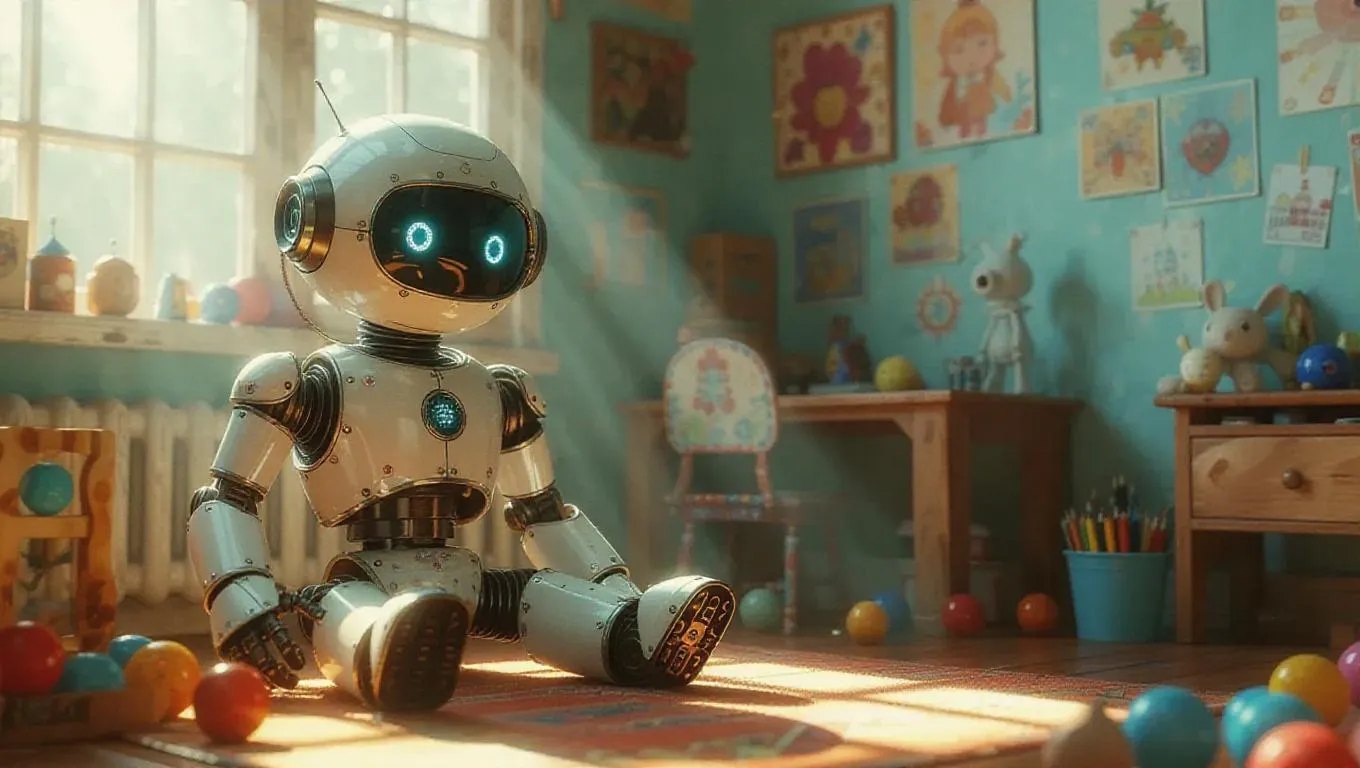 A whimsical scene of an imaginative robot, now a malfunctioning AI companion, leaking oil and sitting in a fantastical child's room. The room is adorned with creative toys and artistic decor, evoking a sense of creativity. A single ray of magical sunlight streams through a whimsical window, casting an enchanting glow on the imaginative robot, highlighting the contrast between its metallic surface and the artistic environment.
