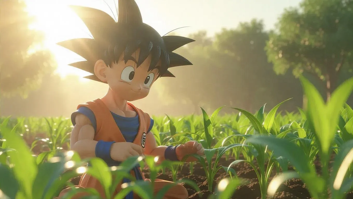 Goku, wearing a rustic farmer's outfit, tends to vibrant crops in a sunlit field. His eyes are cheerful, and his expression is content, enjoying the simplicity of life. The bright sunlight creates a warm, wholesome atmosphere, with lush greenery all around. The light is bright and natural, enhancing the beauty of nature's bounty. The scene is rendered in a wholesome style, celebrating the connection to the earth.
