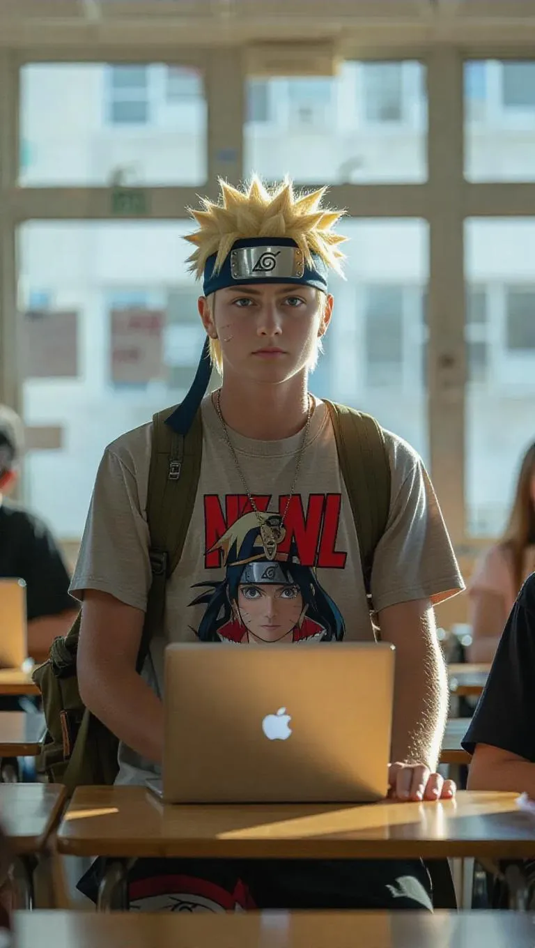 Naruto, a focused student in a campus lecture hall, wears a casual t-shirt and holds a laptop. His ninja headband has been replaced by a backpack. The natural light streaming through the windows creates an inspiring environment, enhancing the rows of desks, adding a motivational tone to the academic scene. The style is bright, capturing the dynamic educational atmosphere.