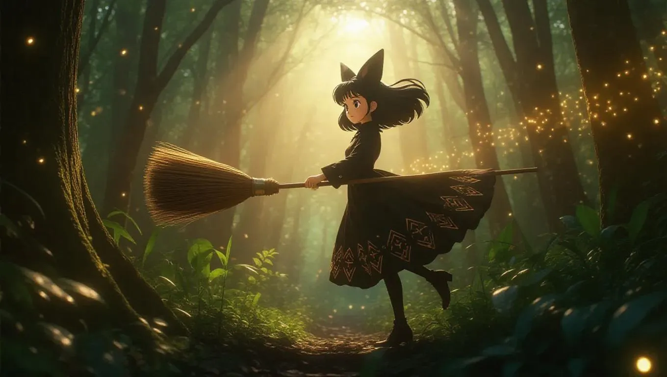 Kiki, the adventurous courier from *Kiki’s Delivery Service*, zips across an ancient, mystical forest on a jet-powered broom. Her humble dress is transformed into an intricate mage robe adorned with runes, reflecting her connection to nature. The forest is illuminated by soft, golden glows filtering through the leaves. The lighting is ethereal, with greens and warm earth tones, creating a magical atmosphere. The scene occurs at twilight, with fireflies dancing in the air.