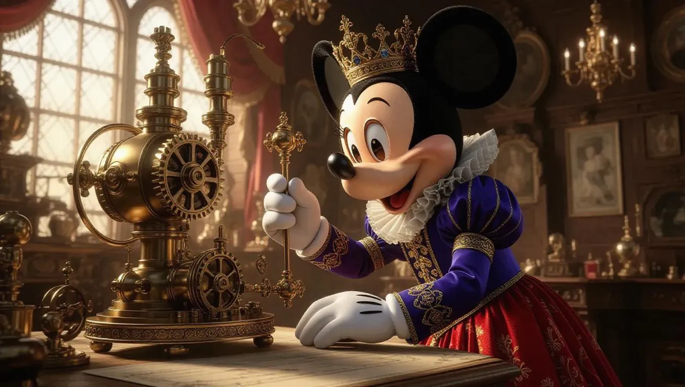 Mickey Mouse, dressed in an elegant royal court attire with frills, a ruffled collar, and a jeweled scepter, is meticulously working on a complex machine filled with intricate gears and steam pipes. He is bent over the contraption, his hands deftly adjusting the mechanisms. The royal workshop is cluttered with ornate decorations, scrolls, and half-finished inventions. Rich, golden light from chandeliers casts long shadows, highlighting the luxurious fabrics and fine details. The scene is rendered in a detailed, realistic style, capturing the opulent charm and mechanical ingenuity of the era.