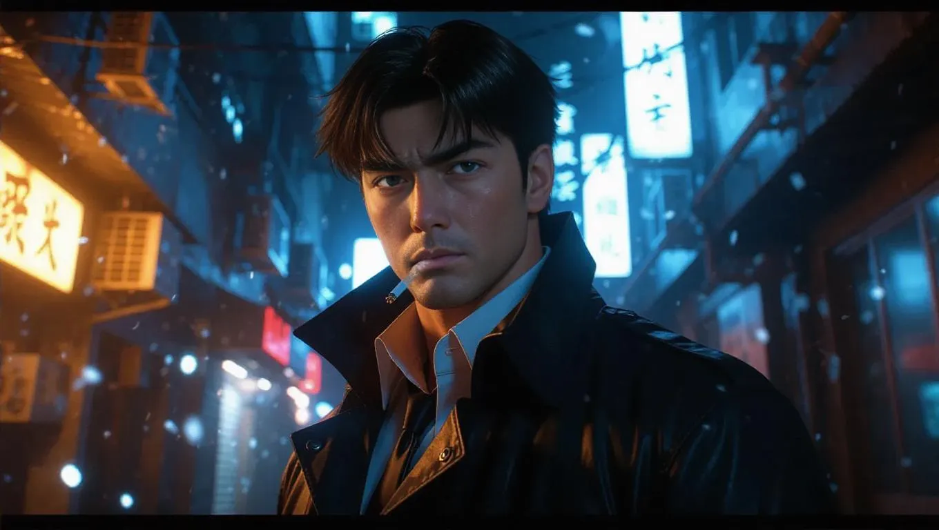 A rugged adult Detective Conan, with stubble and a cigarette, investigates a human trafficking ring in a murky, neon-lit alley. High-tech clues float on holograms, casting a sinister glow. The alley's gritty, urban design contrasts with Conan's worn, determined expression. Soft, cool blue and grey lights highlight the technology, while hard, warm shadows emphasize his intense focus and the gravity of the scene. The style is a blend of noir and street art, capturing both the gritty realism and the vibrant details.