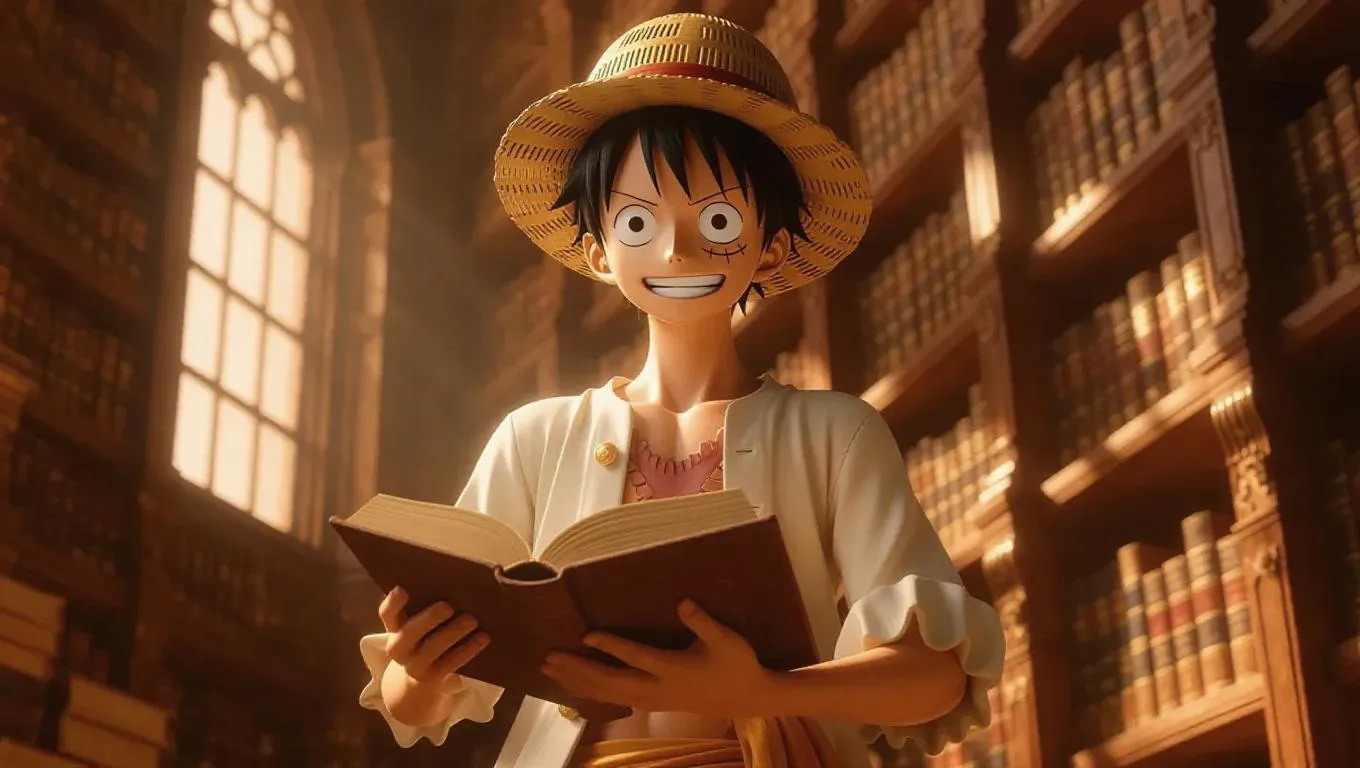 Luffy from One Piece, dressed in a painter's smock, stands amidst towering bookshelves in a grand library. He is energetically organizing books, his expressive face showing a mix of concentration and excitement. The warm, ambient lighting casts soft shadows, highlighting the rich wooden shelves and the intricate architectural details. The scene exudes a cozy, inviting atmosphere, blending the whimsical charm of Luffy with the timeless elegance of a classic library.