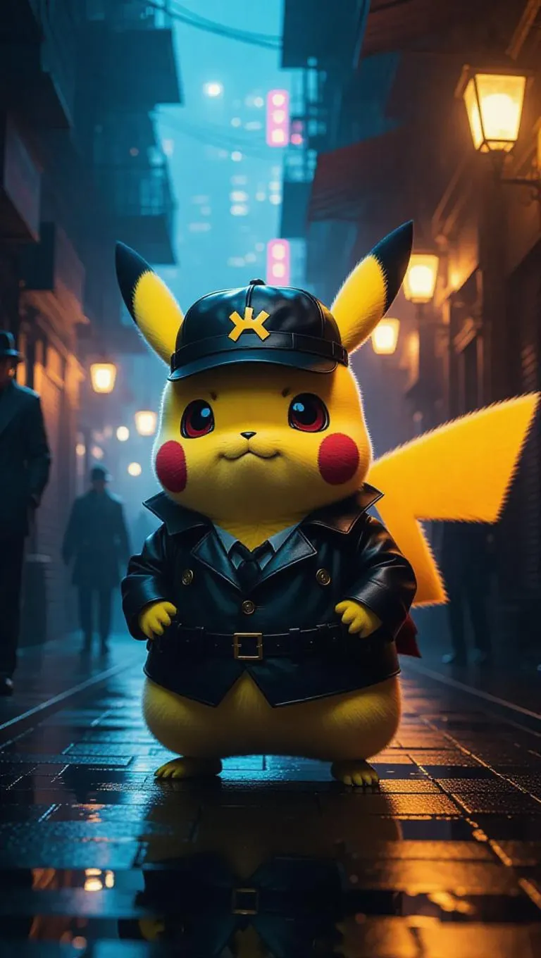 Pikachu, in a vintage detective outfit, stands tall in a foggy city alley. Its cheeks spark with electricity, and its shrewd eyes reflect the noir, suspenseful atmosphere. Shadowy figures loom nearby, adding an intriguing yet tense ambiance. The alley is shrouded in soft, mysterious light, creating a dramatic glow that enhances the scene's intrigue. The style is a blend of realism and anime, capturing Pikachu's inquisitive stance and the moody beauty of the environment.
