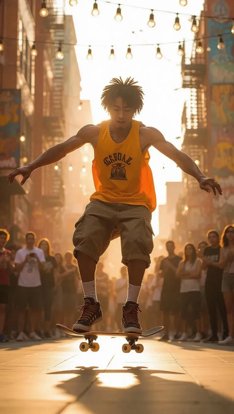 Aladdin, dressed in a bright tank top and cargo shorts, performs eye-catching skateboard tricks in an eclectic art district. His lively movements and enthusiastic expressions energize a crowd of art enthusiasts. The district is alive with artistic installations, enhancing the creative backdrop. Soft, golden sunlight filters through, casting warm, diffused light that enhances the dynamic action and the vibrancy of the scene.