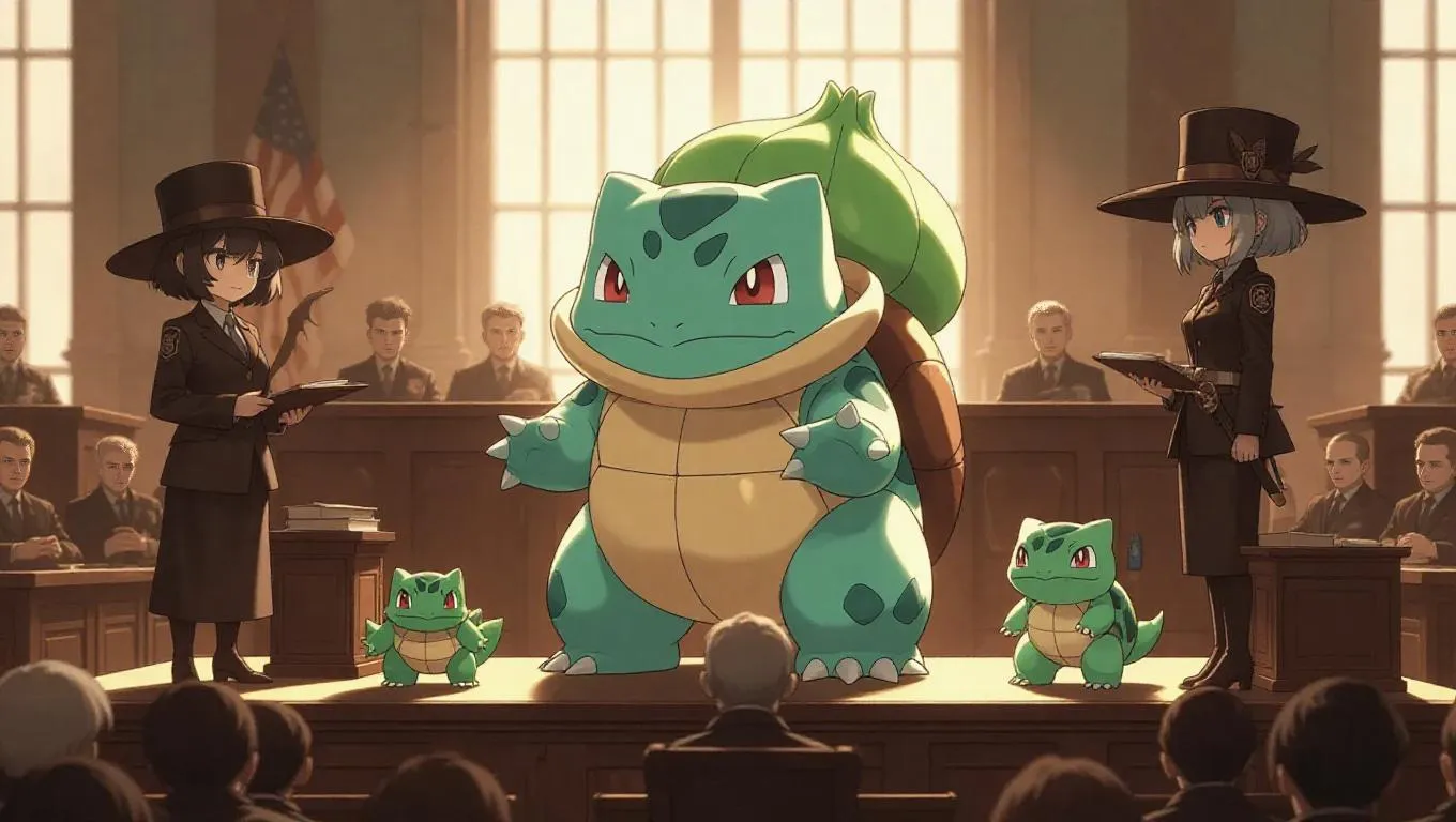In a minimalist courtroom, Bulbasaur stands accused of war crimes, dressed in a rugged adventurer outfit. Oak, his loyal lawyer, stands confidently by his side, while Sabrina, the prosecutor, glares with fierce intelligence. The surreal and absurd atmosphere is heightened by the presence of various Pokémon witnesses and a judge presiding over the proceedings. Soft, muted lighting casts gentle shadows, emphasizing the gravity of the situation while adding a touch of whimsy. The scene is rendered in a simplistic artistic style, blending the mundane with the fantastical.