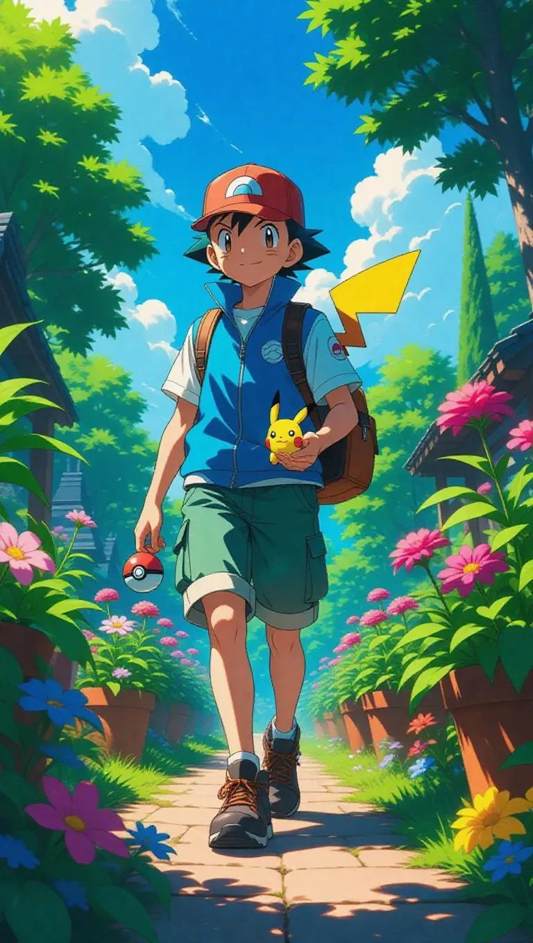 Ash Ketchum, a matured Pokémon trainer, wanders through a lush garden, his clean cap and robust Pokéball belt symbolizing hope. A vintage Pikachu toy dangles from his backpack, its faded colors softening the mood. The garden is in full bloom, with bright colors and sunlight brightening every corner, creating a joyful and serene ambiance. The scene is rendered in an impressionistic style, highlighting the vibrant and colorful beauty of the environment.