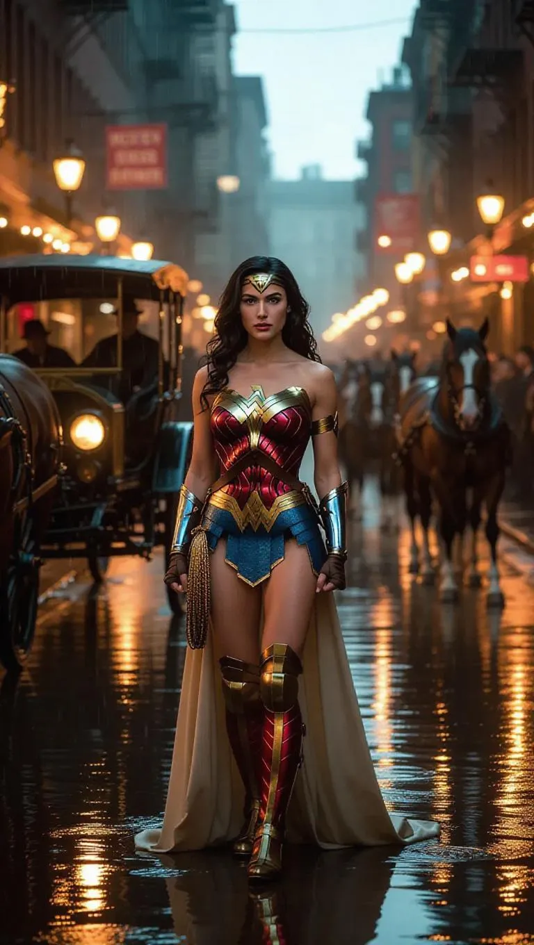 Wonder Woman, in a traditional gown and sash, stands on a rainy 1940s city street, her proud expression illuminated by the charming street radios. Horse-drawn carriages line the wet street, reflecting the shiny pavement. Gentle, cream light spills from the windows of nearby taverns, casting cozy shadows. The scene is rendered in a classic style, with soft contrasts and an inviting, warm ambiance.