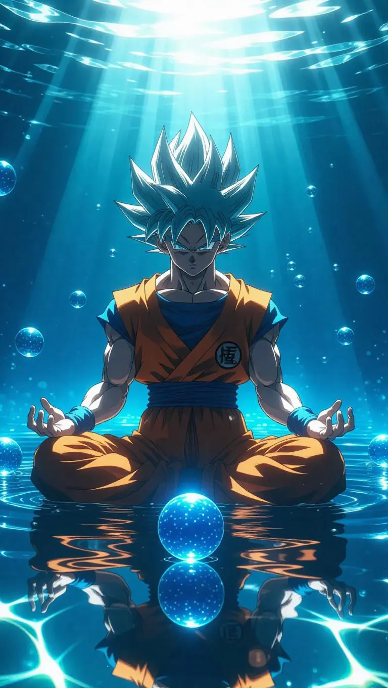 Goku meditates alone in an underwater scene, his hair shimmering like seafoam. His flowy attire ripples gracefully as aquatic Dragon Balls float around him. Diffused sunlight filters through the waves, creating an otherworldly and tranquil atmosphere.