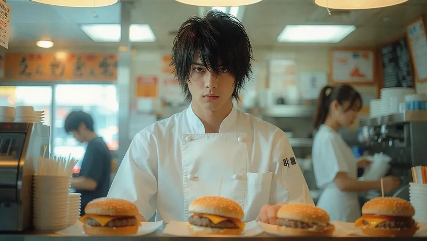 Light Yagami, dressed in a chef's uniform, stands behind the counter, flipping burgers with a bored expression. His sharp features are slightly dulled by the monotony of the task. The Death Note is discreetly tucked under the cash register, adding a dark contrast to the cheerful, fluorescent-lit environment. Customers queue up, and he takes dine-in orders with a forced smile, his eyes betraying his inner turmoil. Soft, diffused overhead lights cast a neutral tone, emphasizing the mundane setting. The style is realistic, with a touch of psychological tension.