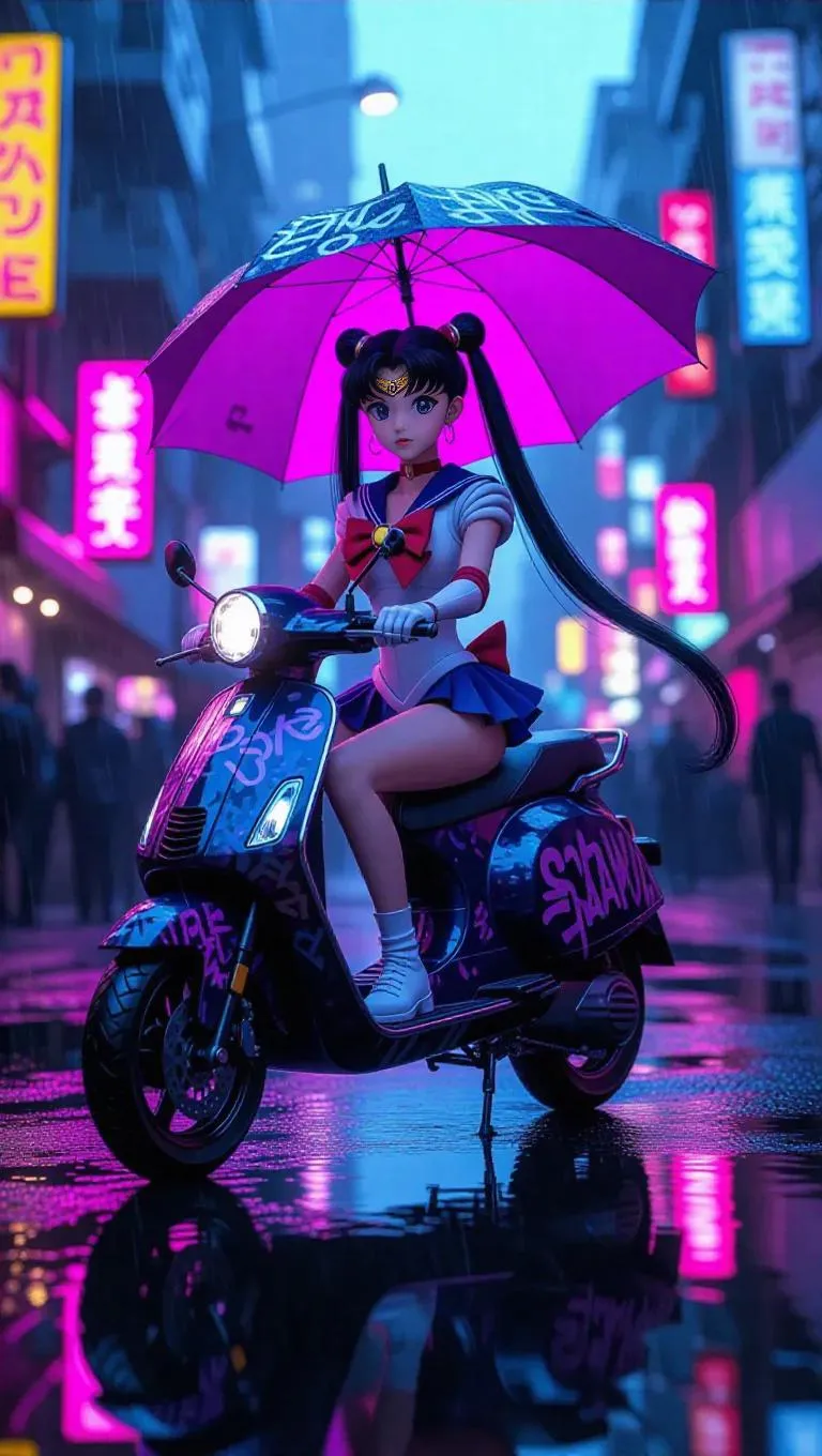Sailor Moon rides a graffiti-covered scooter through a rain-soaked street, her tiara replaced with a baseball cap and an umbrella in hand. Her slick sailor outfit gleams under the wet pavement reflections, and futuristic holograms flutter behind her. The scene is drenched in moody, rainy shadows, with a blend of muted and bright colors. The style is dystopian noir, merging futuristic elements with a melancholic atmosphere.