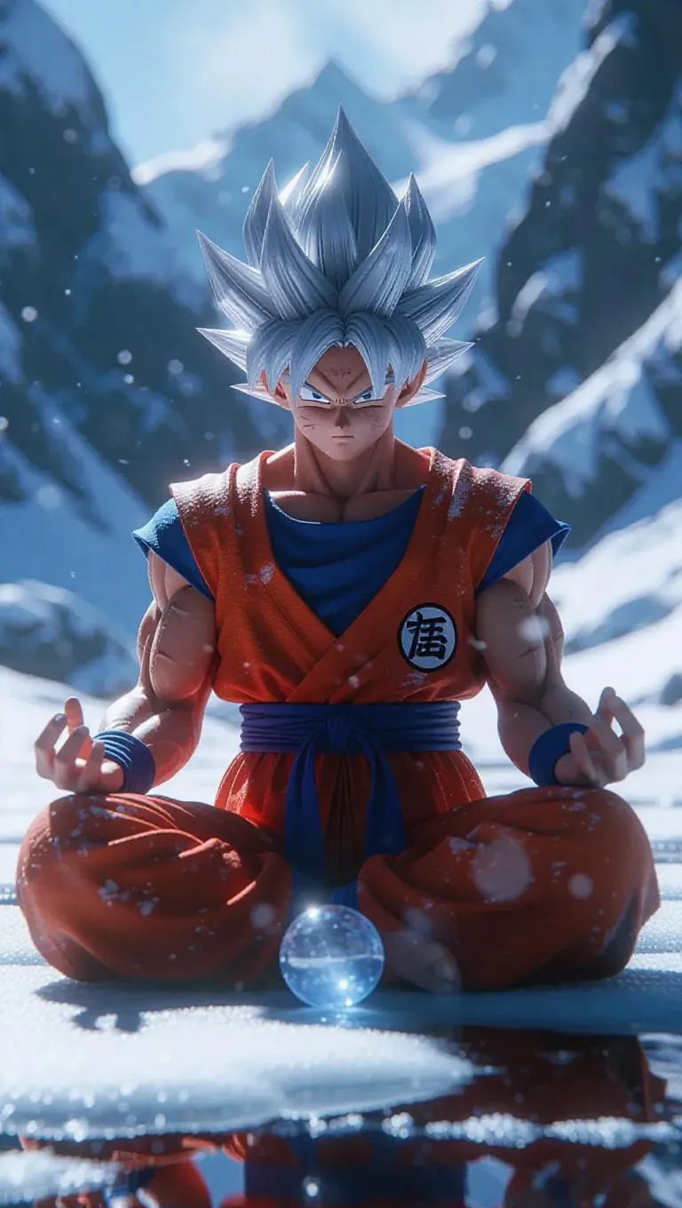 Goku meditates alone on an icy tundra, his hair frosted white. His heavy winter garb sways in the cold wind as glacial Dragon Balls swirl around him. Chilling sunlight creates icy reflections, enhancing the solitude, forming a solemn yet beautiful atmosphere.