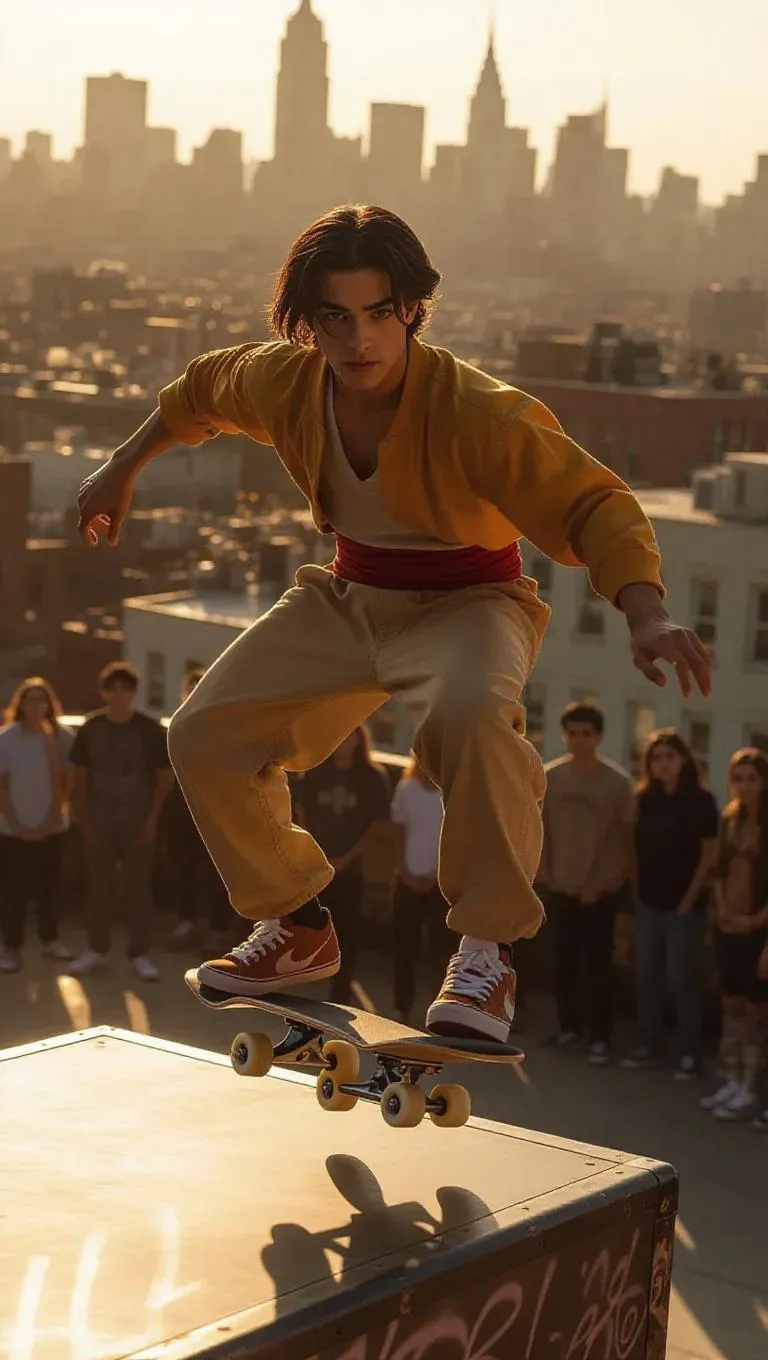 Aladdin, clad in a minimalist jumpsuit and sneakers, showcases stylish skateboard tricks in an urban rooftop skate park. His impressive movements and confident expressions captivate a gathering of young adults. The rooftop is surrounded by city skyline views, creating a dramatic backdrop. Soft, golden sunlight filters through, casting warm, diffused light that highlights the dynamic action against the backdrop of metropolitan life.