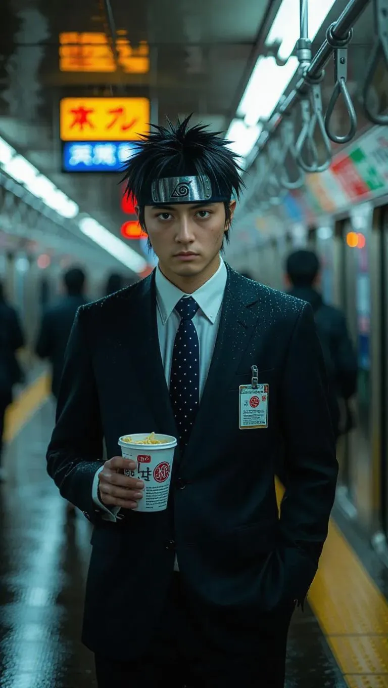 Naruto, a tired office worker in a crowded Tokyo metro, wears a wrinkled suit and holds a cup of instant ramen. His ninja headband has been replaced by a corporate ID badge. The moody fluorescent lighting casts long shadows, reflecting off the rain-drenched windows, adding a somber tone to the bustling subway scene. The style is realistic, capturing the gritty urban atmosphere.