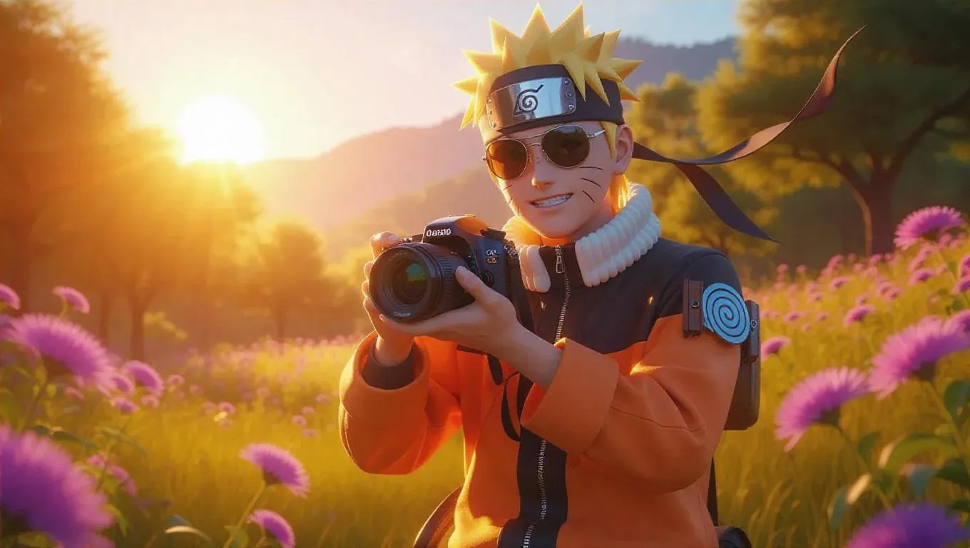 Naruto, an enthusiastic traveler in a scenic park, wears a summer outfit and holds a camera. His ninja headband has been replaced by sunglasses. The golden sunset light bathes the landscape, creating a picturesque view, enhancing the colorful flowers, adding a joyful tone to the outdoor adventure scene. The style is vibrant, capturing the cheerful nature atmosphere.