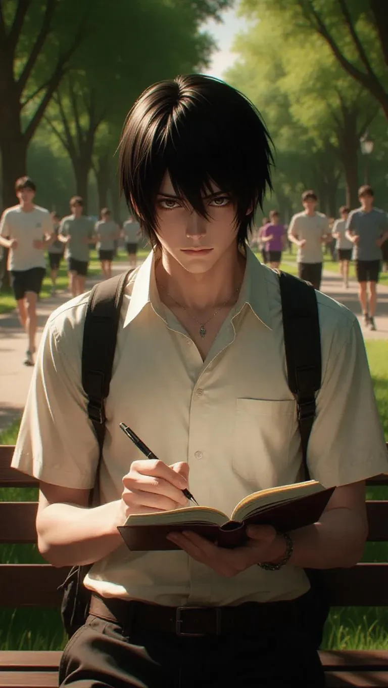 Light Yagami, wearing a casual outfit, stands in a park, sketching in a notebook with a tired expression. His sharp features are slightly dulled by the monotony of the task. The Death Note is discreetly hidden beneath a nearby bench, adding a dark contrast to the cheerful, green surroundings. Passersby jog past, and he sketches with a forced smile, his eyes betraying his inner turmoil. Soft sunlight casts a warm glow, enriching the peaceful atmosphere. The style is realistic, with a touch of psychological tension.