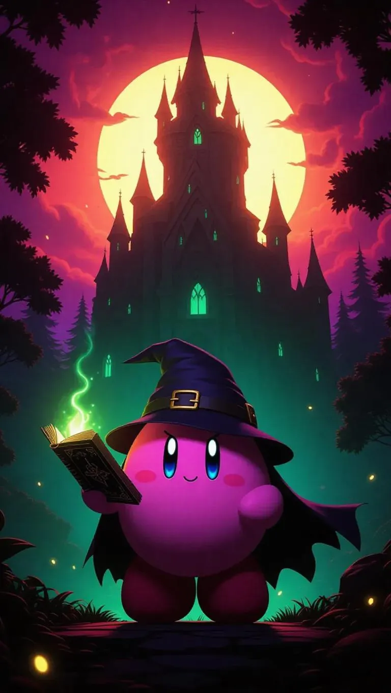Kirby, reimagined as a mysterious sorcerer, dons flowing, dark robes that shimmer under the moonlight. He holds an ancient spellbook, his eyes glowing with knowledge. Floating above an enchanted forest, swirling mists and fireflies dance around him, adding to the magical atmosphere. Behind him, a crumbling stone tower rises, its windows casting an eerie green glow across the shadowy woods. The scene is enveloped in dim, ethereal lighting, emphasizing the enchanting contrast between Kirby's mystical presence and the otherworldly surroundings. The style is a blend of dark fantasy and magic, creating a visually captivating and surreal image.