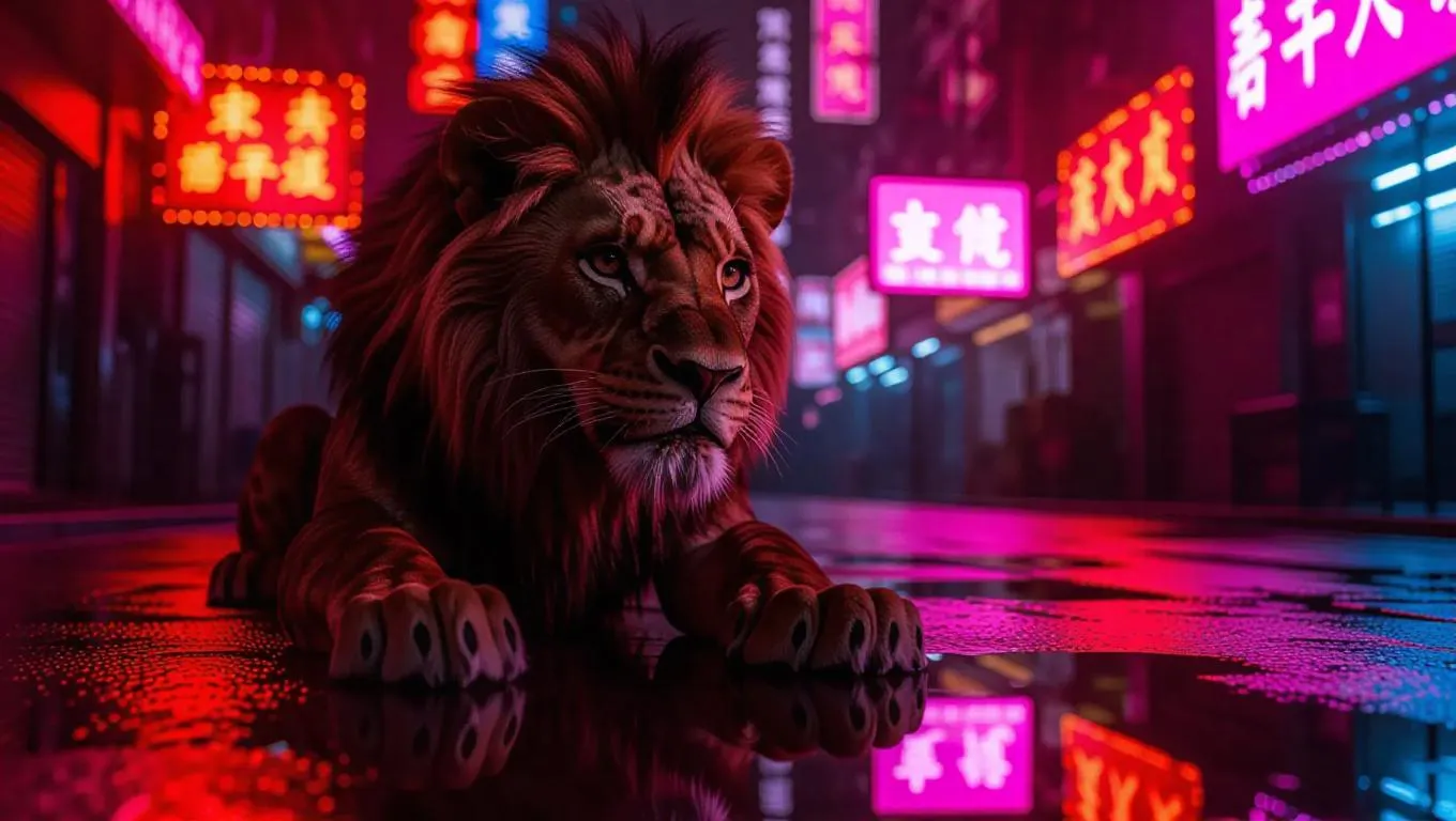 Simba, the lion detective, intersects a pothole-ridden street in a cyberpunk city. He is adorned in a high-tech armor that glimmers under the neon drips. His attentive eyes look for signs of trouble amidst the vibrant chaos. Digital billboards flash chaotic colors, casting intricate shadows that fork into narrow alleyways. This scenario reflects an electrifying, futuristic film noir vibe, blending high-tech light pulses with ever-present shadows.