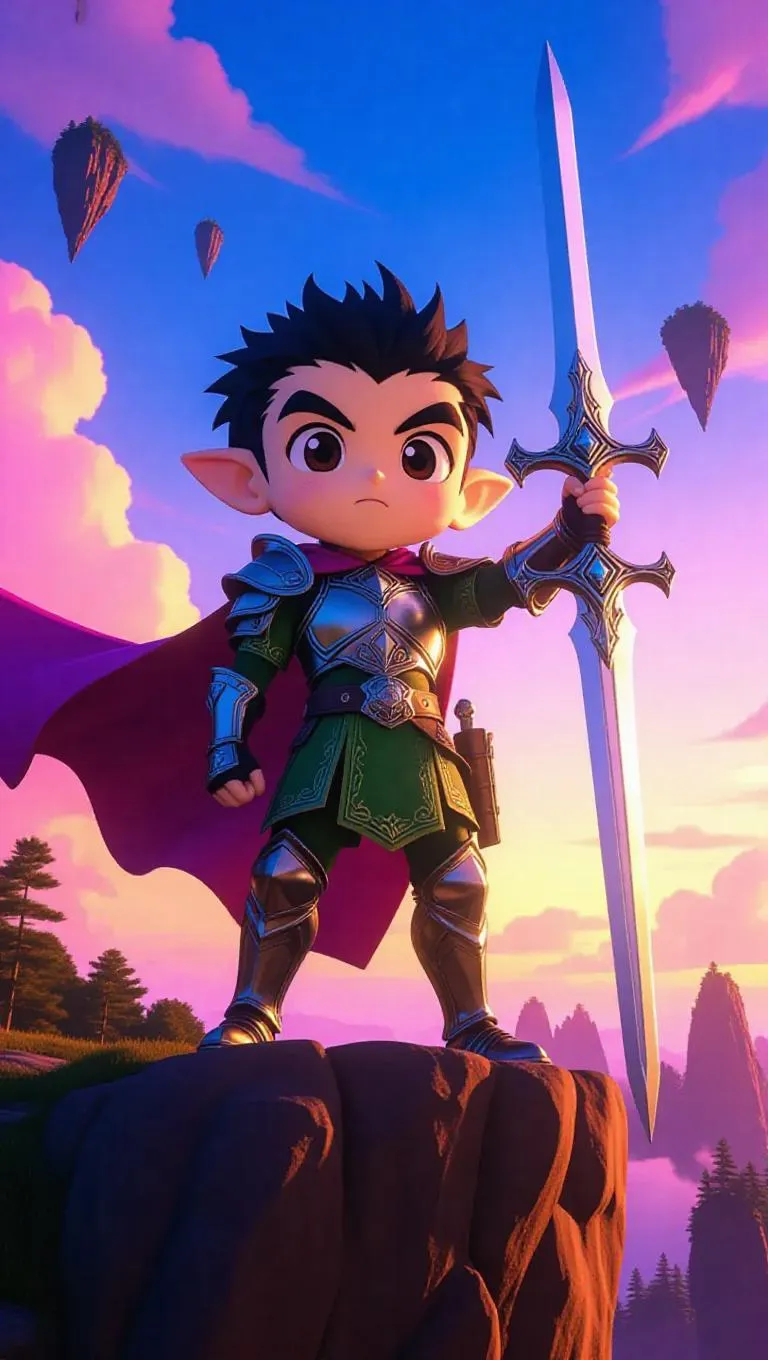 Shin Chan, transformed into an elf prince, stands valiantly on a rugged cliff. He wears intricate elven armor and a flowing cloak, his determined expression illuminated by the glow of his enchanted sword. The magical sky above is filled with floating islands, bathed in soft, warm light that casts gentle shadows and highlights. The scene is rendered in a high-fantasy style, with vibrant colors and meticulous detail, capturing the ethereal beauty of the moment.