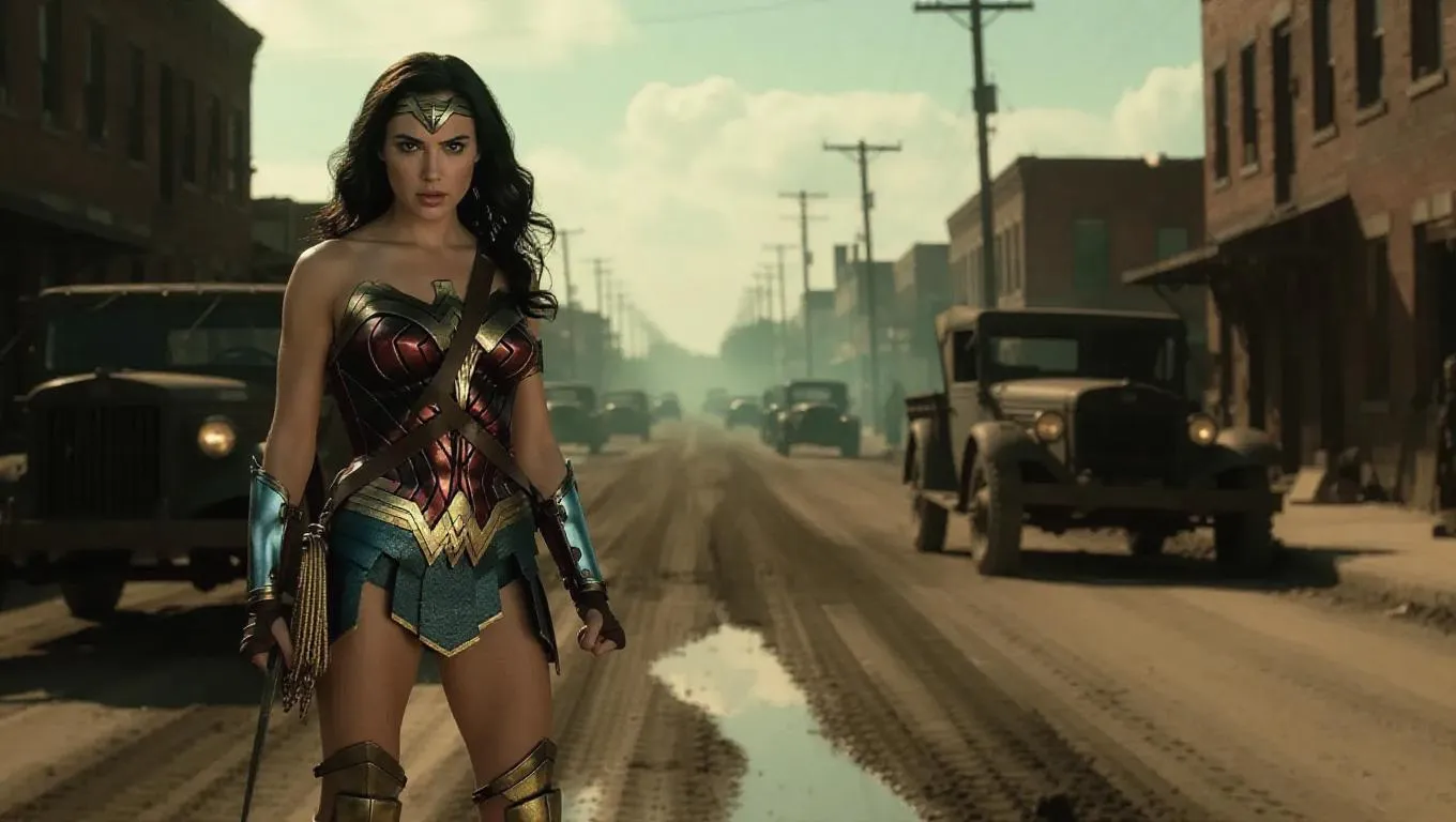 Wonder Woman, in an armored suit and combat helmet, stands on a dusty 1940s city street, her serious expression illuminated by the flickering lights. Military vehicles line the desolate street, reflecting the cracked pavement. Dim, green light spills from the windows of nearby barracks, casting stark shadows. The scene is rendered in a gritty style, with harsh contrasts and a tense, dramatic tone.