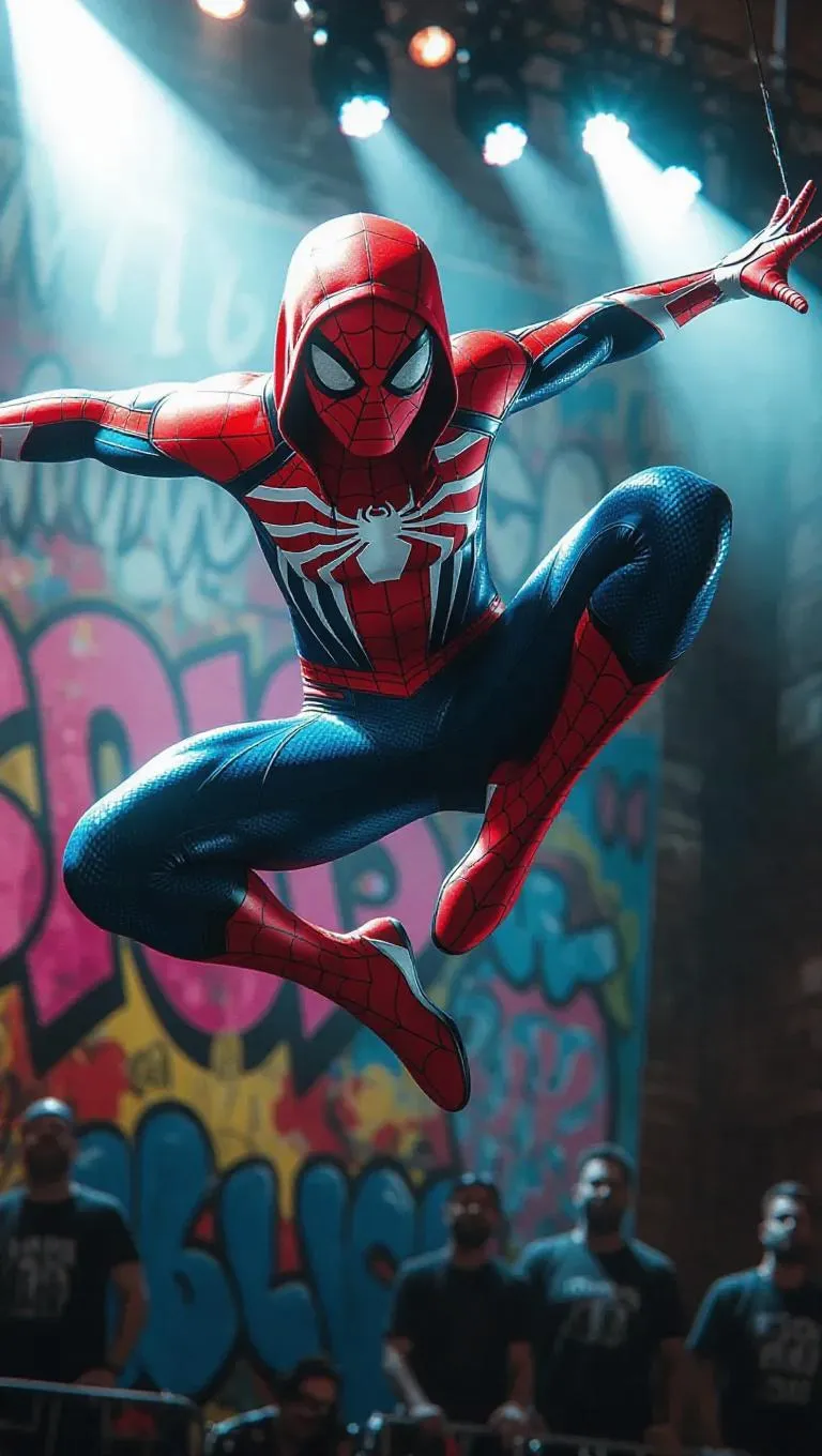Spider-Man, dressed in a dynamic, graffiti-inspired outfit with bright colors and a hood, performs a mid-air move on an urban street stage. His muscles are taut, capturing the dynamic tension of his leap. The theater is adorned with urban culture elements and street art, creating an elegant backdrop. Dramatic spotlights cast a mix of streetwise and cool tones, highlighting his form and casting long shadows, enhancing the theatricality of the scene. The style blends the realism of Spider-Man's superhero physique with the vibrancy of street performances.
