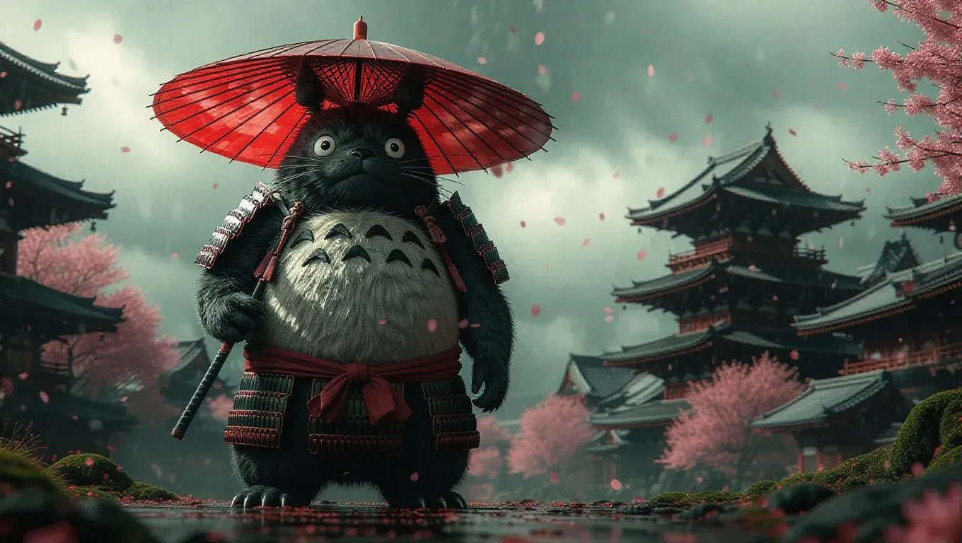 Totoro stands tall on a war-torn battlefield, his fur matted and eyes glowing a fierce red. Clad in samurai armor intricately fused with organic moss and steel, he wields a bloodstained umbrella as a formidable weapon. Stormy skies loom overhead, with sakura petals falling amidst the rising smoke, creating a hauntingly beautiful backdrop. The scene is bathed in dramatic, moody lighting, with harsh shadows and diffused highlights, emphasizing the tension and intensity of the moment. The style is a blend of realistic and fantasy elements, capturing both the surreal and the gritty.